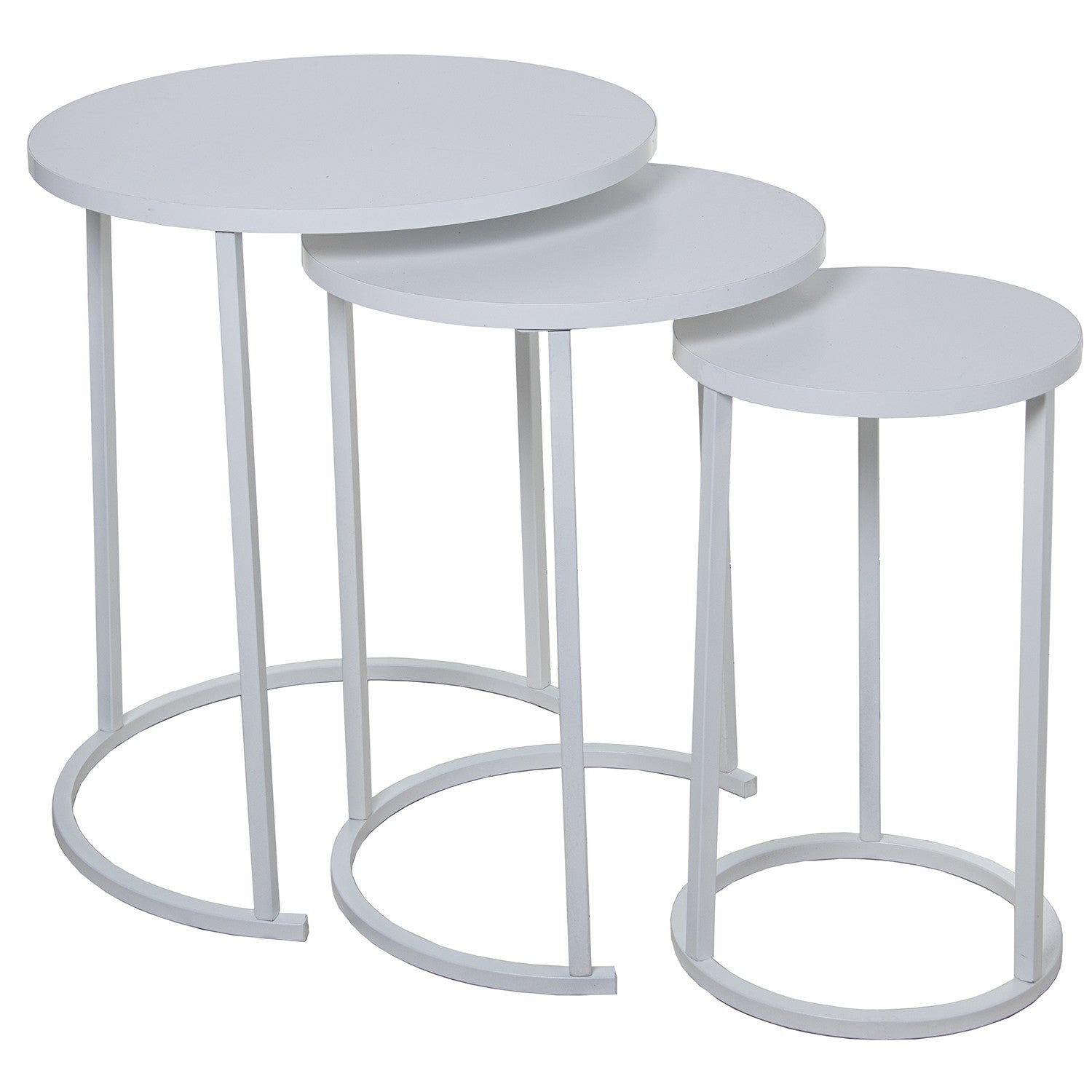 Set 3 Mesas Aux. Madera Patas Metal Blanco, Madera Blanca Ø48x58+ø38x52,5+ø28x48cm