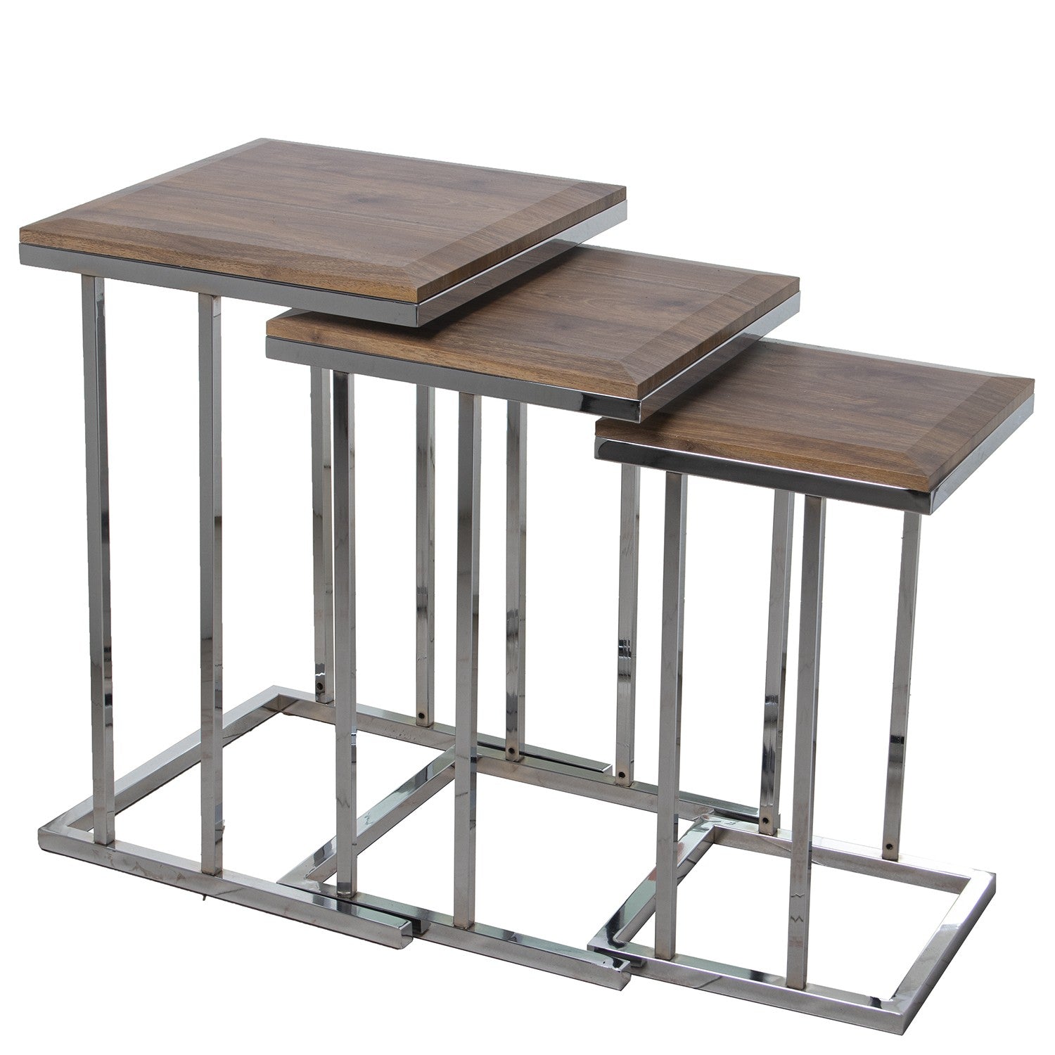 Set 3 Mesas Aux. Madera Patas Metal Cromado, Tablero Bisela 40x40x60+35x35x56+29x29x50cm