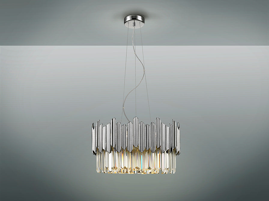 Candeeiro realizado em metal cromado. Abajur de prismas de vidro facetado com remate de peças de abs cromado.