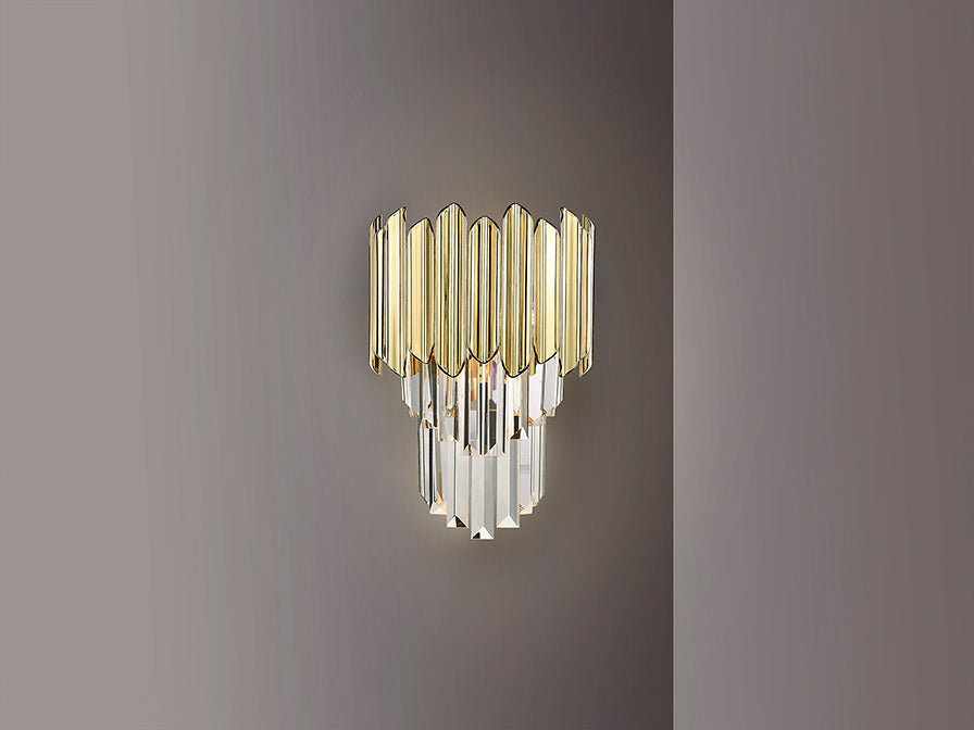 Candeeiro de parede, em metal acabamento cromado. Abajur de prismas de vidro facetado com remate de peças de abs acabamento em banho de ouro.