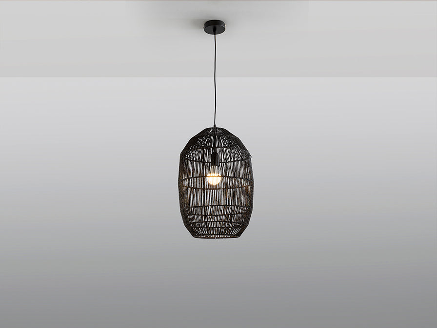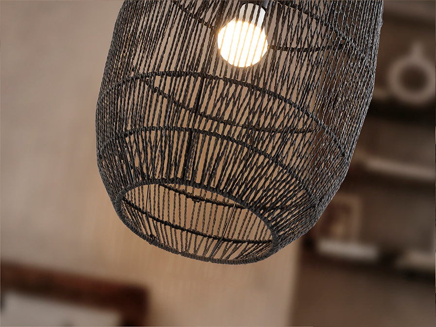 Candeeiro pequeno de 1 luz, realizado em metal, com abajur encordoado em fibra de papel, acabamento preto.