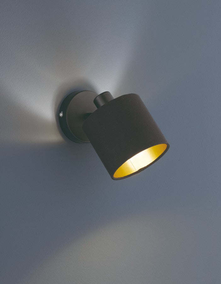 Os projectores da gama TOMMY proporcionam uma iluminação acolhedora, uma vez que os tons têxteis aumentam o fator de conforto e criam um ambiente acolhedor. Ao mesmo tempo, as formas claras evocam um estilo moderno e simples que pode ser utilizado e combinado de várias formas. O projetor de uma chama pode ser utilizado como luz suplementar ou de orientação e pode ser utilizado para realçar áreas individuais. A cabeça giratória tem um diâmetro de 12 cm e pode ser alinhada com precisão. O candeeiro é feito de metal preto mate e é complementado por um abajur em tecido na moderna combinação de cores preto e dourado. A combinação cria um realce de iluminação elegante e dá aos espaços de vida um efeito de bem-estar extraordinário. Para uma iluminação economizadora de energia, recomenda-se a utilização de uma lâmpada LED. Estas são uma óptima alternativa às lâmpadas de halogéneo convencionais e representam uma elevada qualidade de luz e uma poupança de energia de até 80%. Além disso, as lâmpadas LED ajudam-no a beneficiar de uma longa vida útil, de uma baixa produção de calor e, ao mesmo tempo, protegem o ambiente.
