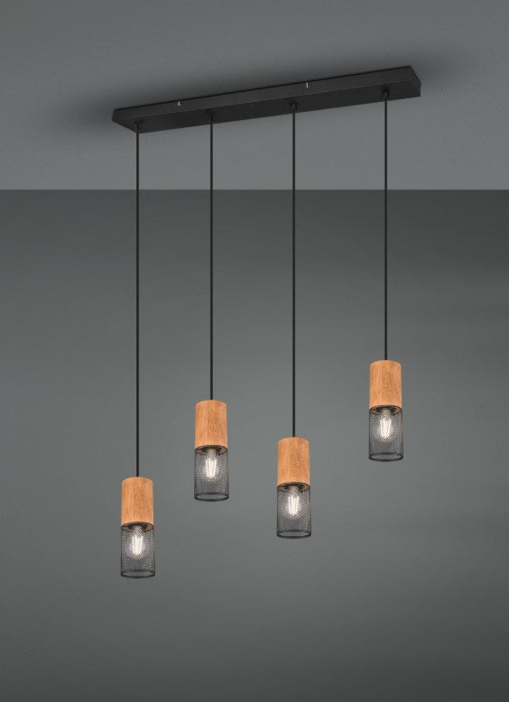 A mistura moderna de metal e madeira tem um aspeto intemporal e está absolutamente na moda. A combinação com materiais naturais tornou-se parte integrante dos espaços modernos e cria também um ambiente acolhedor. A luminária suspensa TOSH é, por isso, a escolha ideal para o ambiente de iluminação correto e para aquele toque especial. Colocado no centro, por cima da mesa de jantar, o pendente de 4 peças é particularmente eficaz. O metal em preto mate, juntamente com os elementos de madeira, pode ser encontrado em estilos de mobiliário modernos e minimalistas.