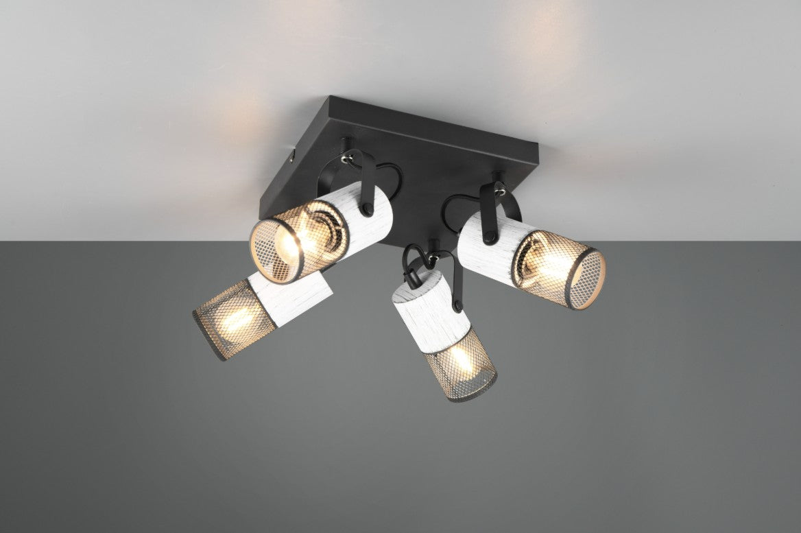 A mistura moderna de metal e madeira tem um aspeto intemporal e está absolutamente na moda. A combinação com materiais naturais tornou-se parte integrante dos espaços modernos e cria também um ambiente acolhedor. O TOSH de 4 focos é, por isso, a escolha ideal para dar um toque de iluminação individual no corredor, na sala de estar ou no quarto. O projetor pode ser ajustado individualmente para uma iluminação de realce direccionada. O metal preto, juntamente com os elementos de madeira em branco antigo, pode ser encontrado em estilos de mobiliário modernos e minimalistas.