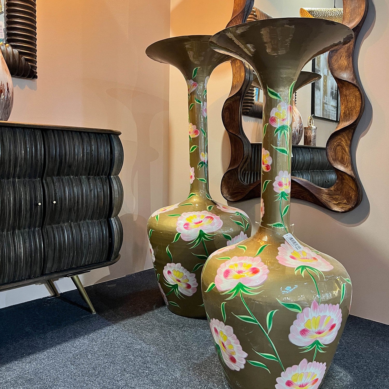 Vaso Em Ferro Decorado Com Flores_ø49x118cm